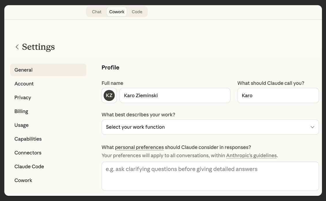 Global Instructions persist across sessions in Cowork. Use them for evergreen details: tone preferences, preferred tools, output formats.
