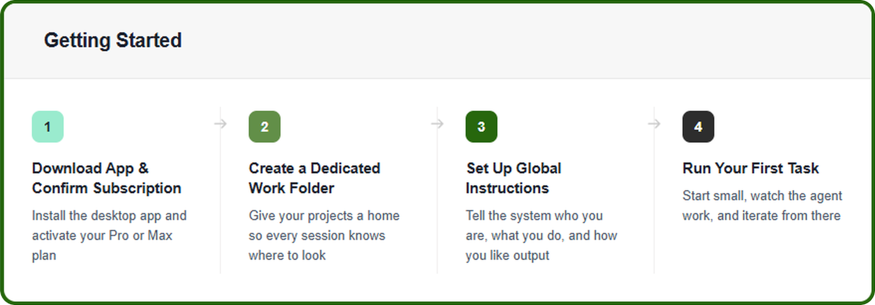 The two most important moves happen before your first task: creating a dedicated work folder and setting your global instructions.