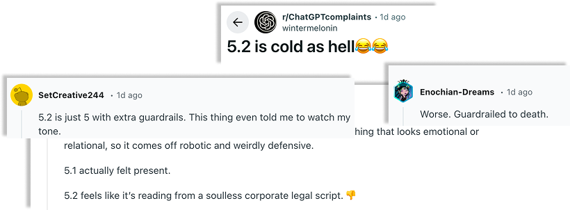 My assumption: with in‑context UX cues that make 5.2’s optimization explicit, users would better understand what they’re getting, and the Reddit backlash might have been softer.