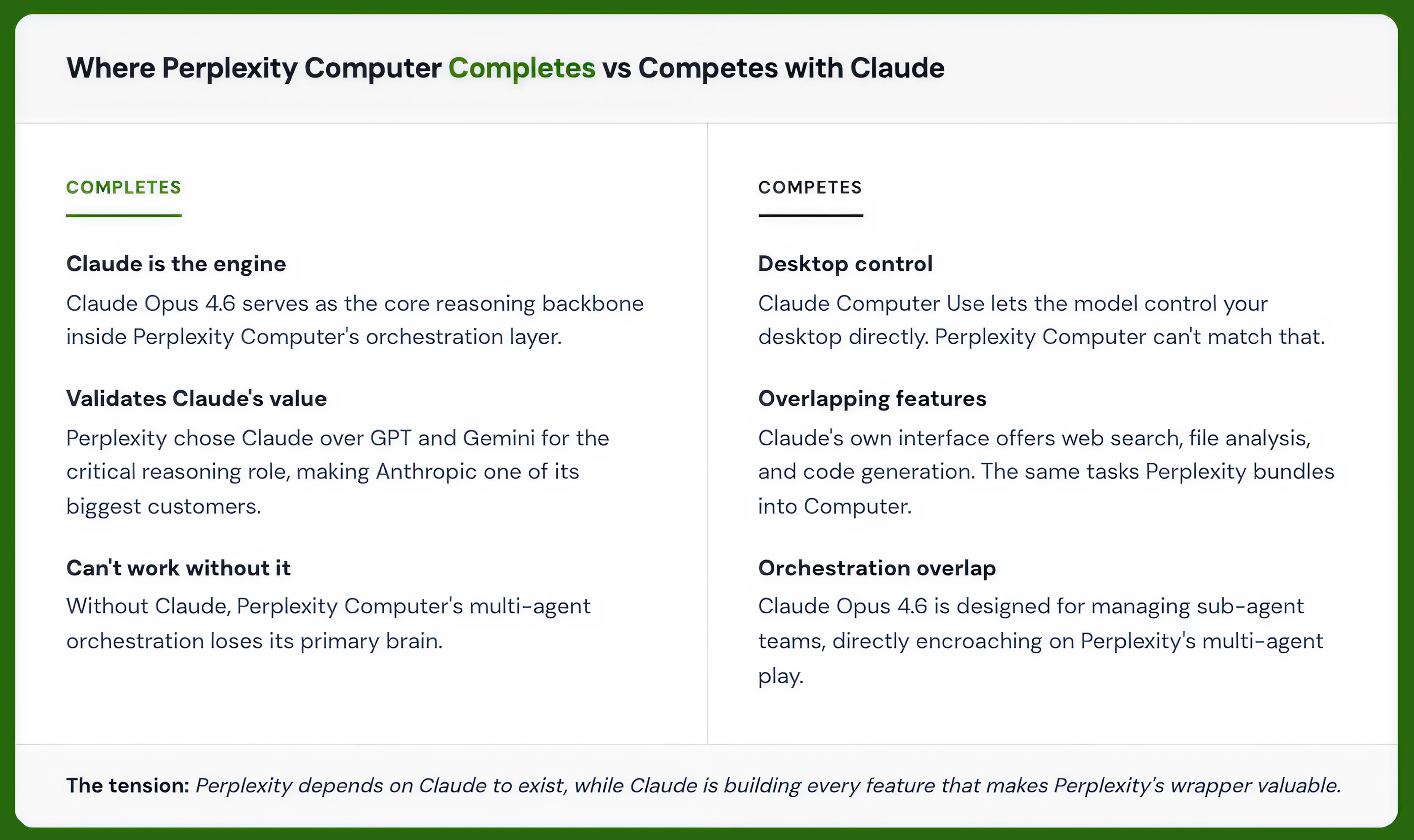 Orchestration overlap: Claude Opus 4.6 is designed for managing sub-agent teams, directly encroaching on Perplexity’s multi-agent orchestration play.