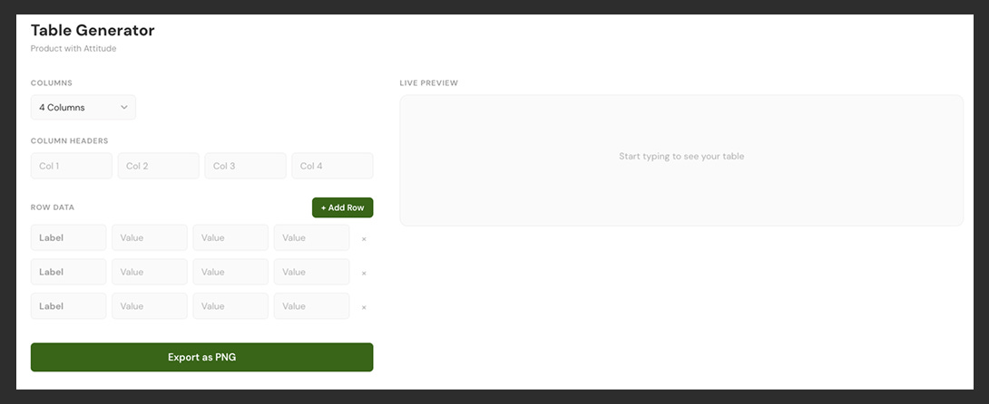 Same deal: column controls, row inputs, live preview, pixel-matched output with the green border and bold first column.