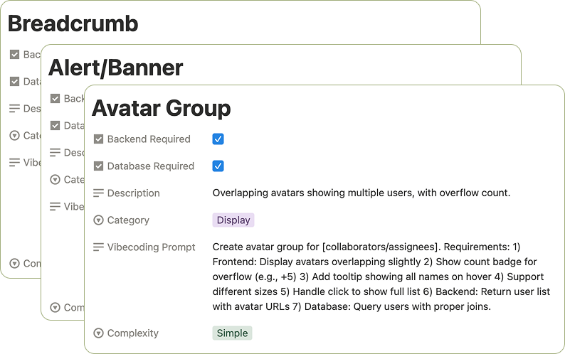 A Notion database cataloging 100+ common UI elements with ready-to-use vibecoding prompts for each one. It’s essentially a prompt library specifically designed for building interfaces with AI.